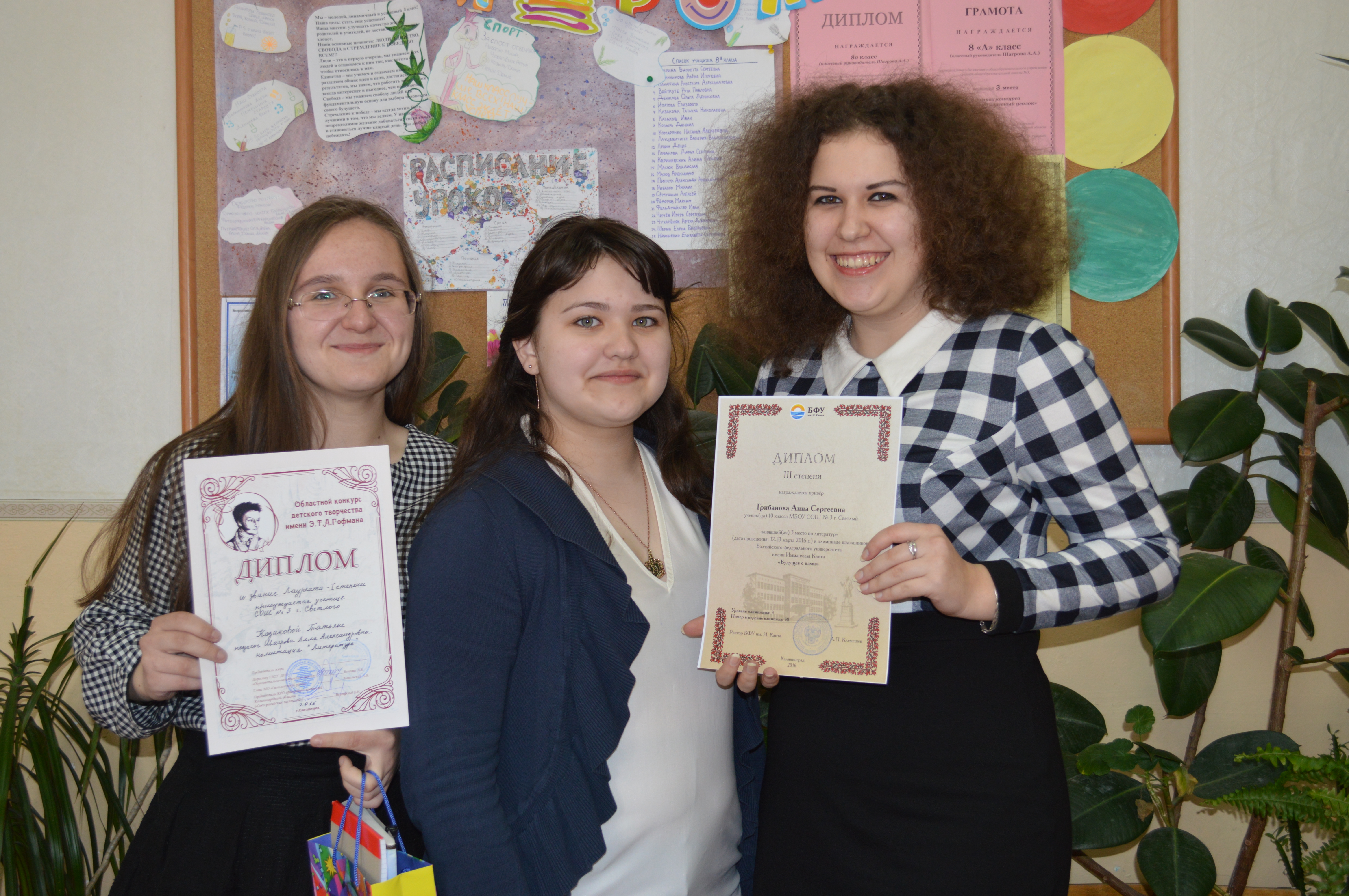 Казакова Татьяна (первая слева), ученица 8а класса, многократная победительница олимпиад и конкурсов, завоевала 1 место и получила диплом лауреата 1 степени Областного конкурса детского творчества имени Э.Т.А.Гофмана в номинации «Литература». Татьяна написала рассказ «Юг» в жанре произведений А.Грина. Особенно восхищались манерой письма директор ОГБОУ ДПО «Образовательного методического центра» г. Светлогорска Волкова Л.В. и председатель КРО организации писателей Калининградской области («Союз российских писателей») Бартфельд Б.Н.